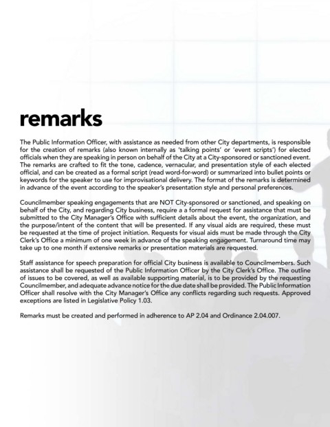 Remarks must be created and performed in adherence to AP 2.04 and Ordinance 2.04.007.